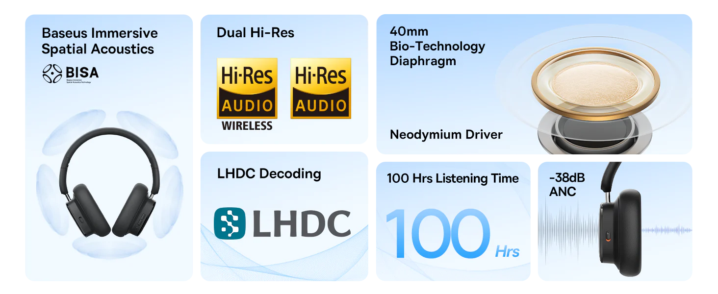 - 100 Jam Pemakaian : Tanpa khawatir kehabisan daya, headphone ini bertahan hingga 100 jam (ANC off, volume 70%).