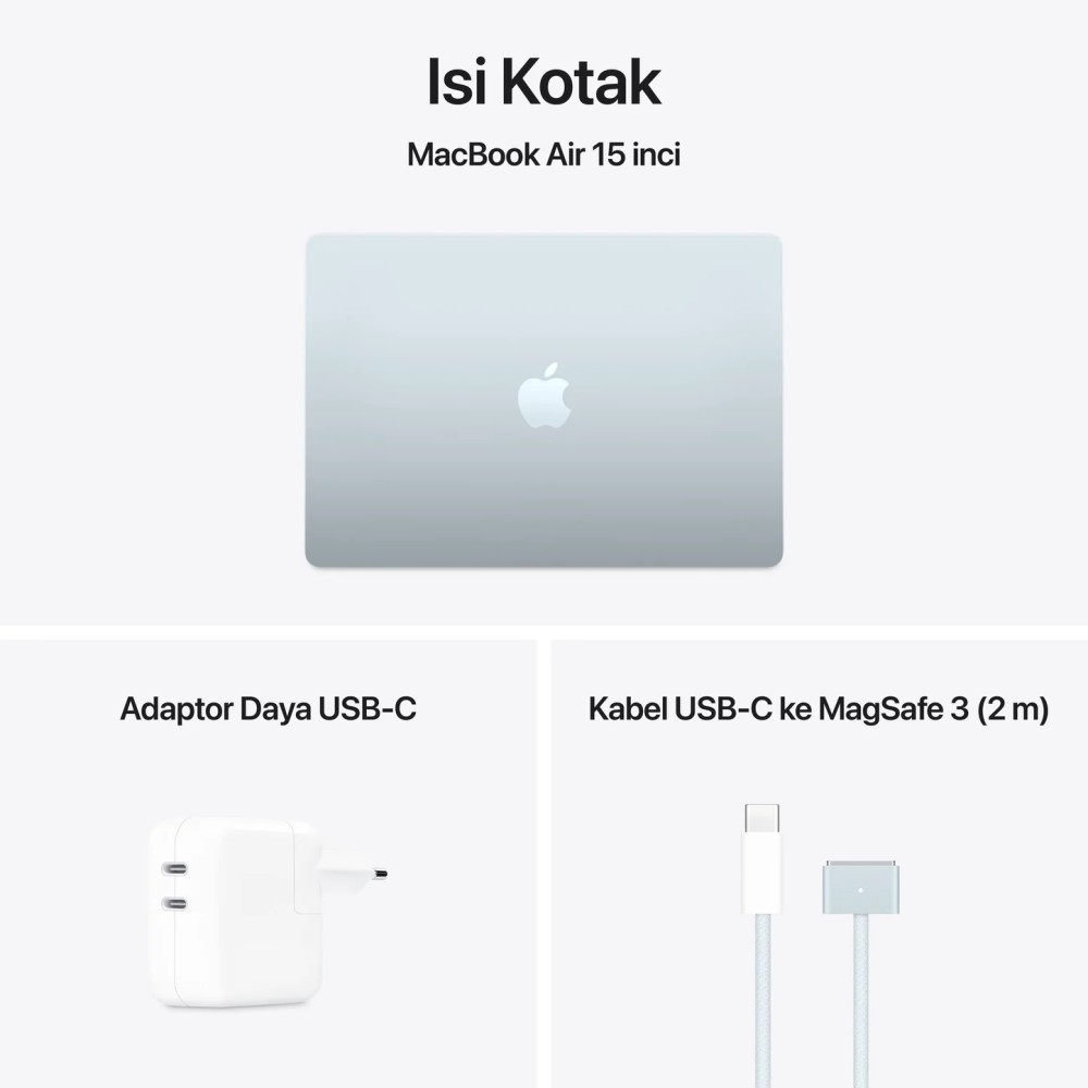 · HUBUNGKAN SEMUANYA — MacBook Air memiliki dua port Thunderbolt 4, port pengisian daya MagSafe, jek headphone, Wi-Fi 6E, dan Bluetooth 5.3.(3) Dan mendukung hingga dua layar eksternal.