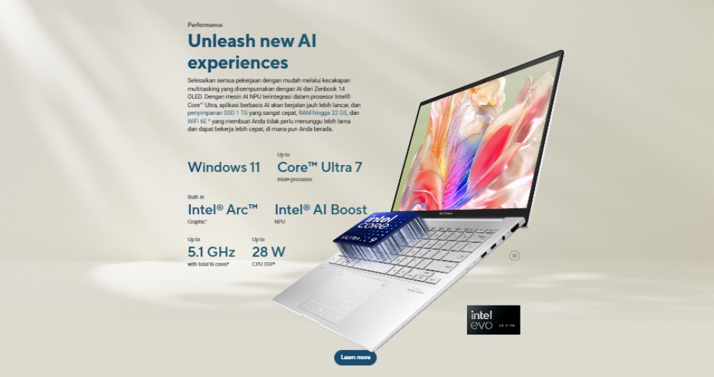 Jantung performa laptop ini adalah Intel Core Ultra 5 Processor 225H. Prosesor modern ini sangat cepat dengan 14 core dan 16 thread (hingga 4.9 GHz). Yang lebih penting, ia memiliki Intel AI Boost NPU hingga 13 TOPS. Ini berarti laptop ini tidak hanya tangguh untuk multitasking biasa, tapi juga sangat dioptimalkan untuk aplikasi berbasis Kecerdasan Buatan (AI), membuat alur kerja Anda lebih efisien.