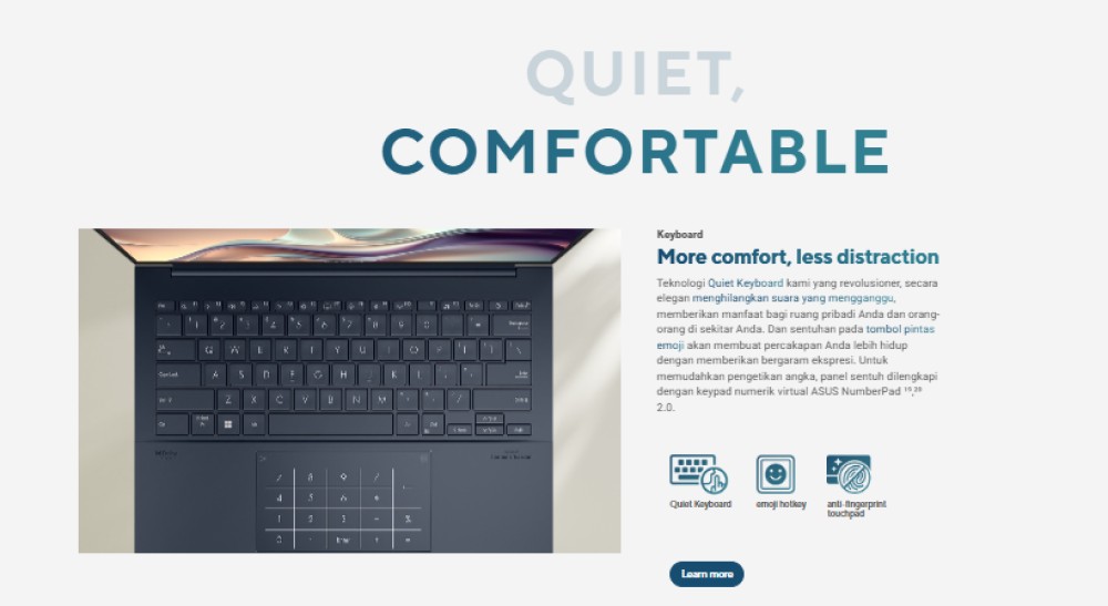 Fitur tambahan lainnya termasuk Keyboard Chiclet backlit yang nyaman dan mendukung NumberPad (touchpad berfungsi sebagai numpad digital). Webcam FHD dengan fungsi IR mendukung Windows Hello untuk login cepat dan aman, dan dilengkapi privacy shutter. Audio jernih berkat Smart Amp Technology dan speaker internal. Dengan baterai 75WHrs dan adaptor Type-C 65W, laptop ini siap menemani Anda seharian penuh.