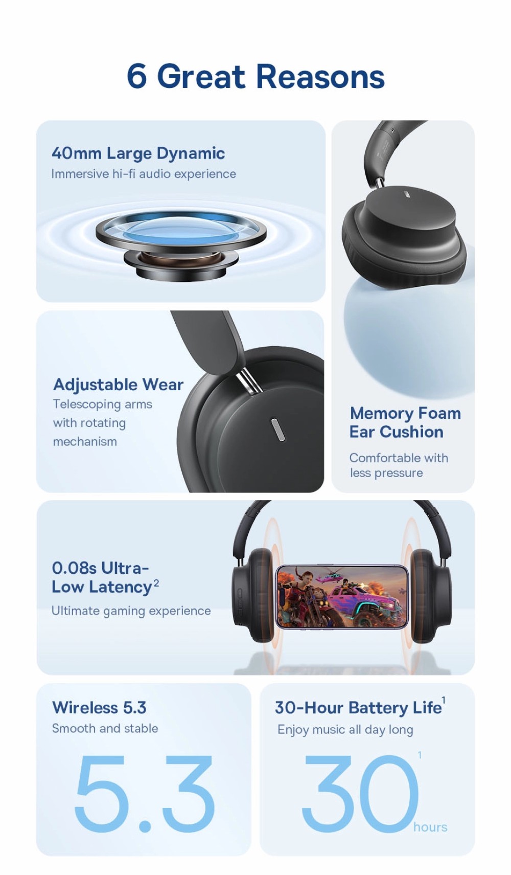 Baseus Smart Connect (BSC) - Secara otomatis mendeteksi panggilan telepon dan terhubung dengan perangkat tersebut saat headphone dipasangkan dengan 2 perangkat secara bersamaan