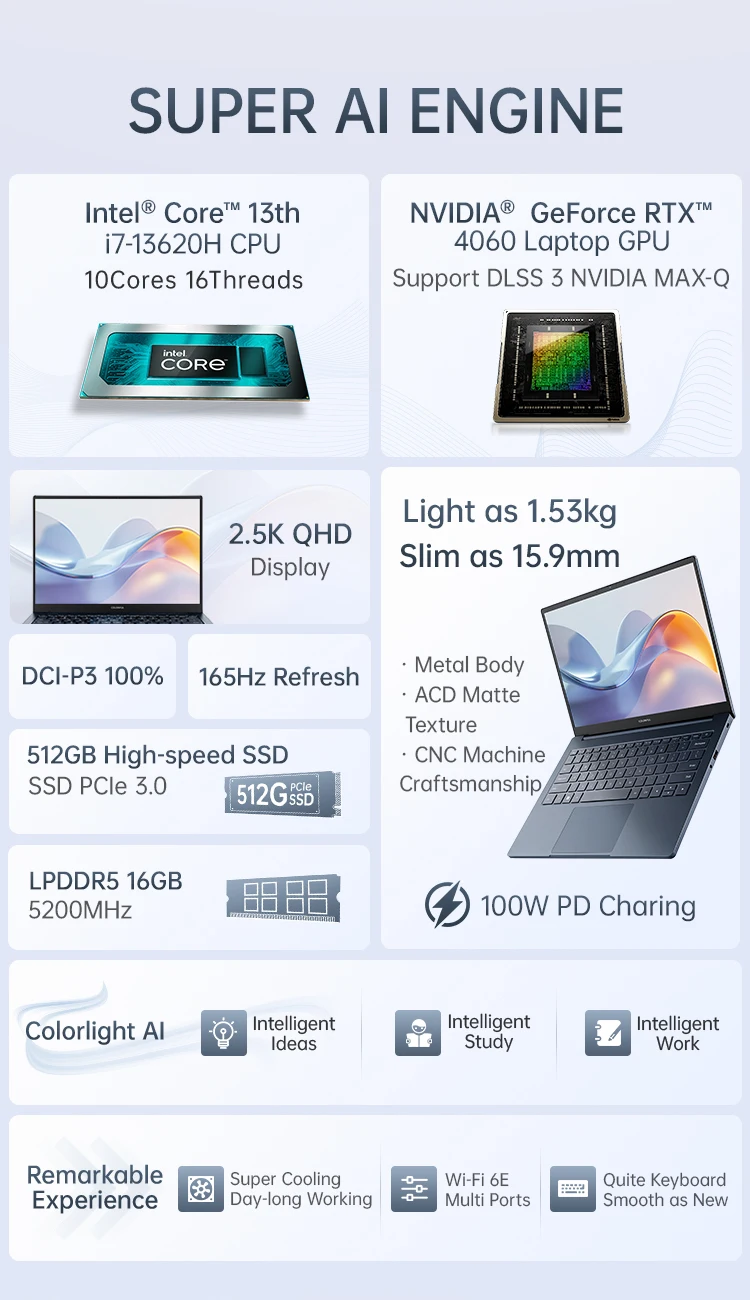 Display: 14" QHD (2560x1440), 16:10 aspect ratio, 165Hz Refresh rate