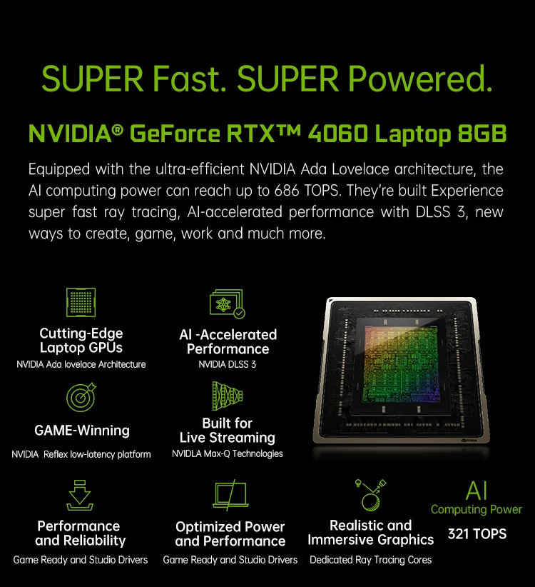 Graphics: NVIDIA GeForce RTX 4060 Laptop GPU 8GB GDDR6 (TDP MAX 100W)
