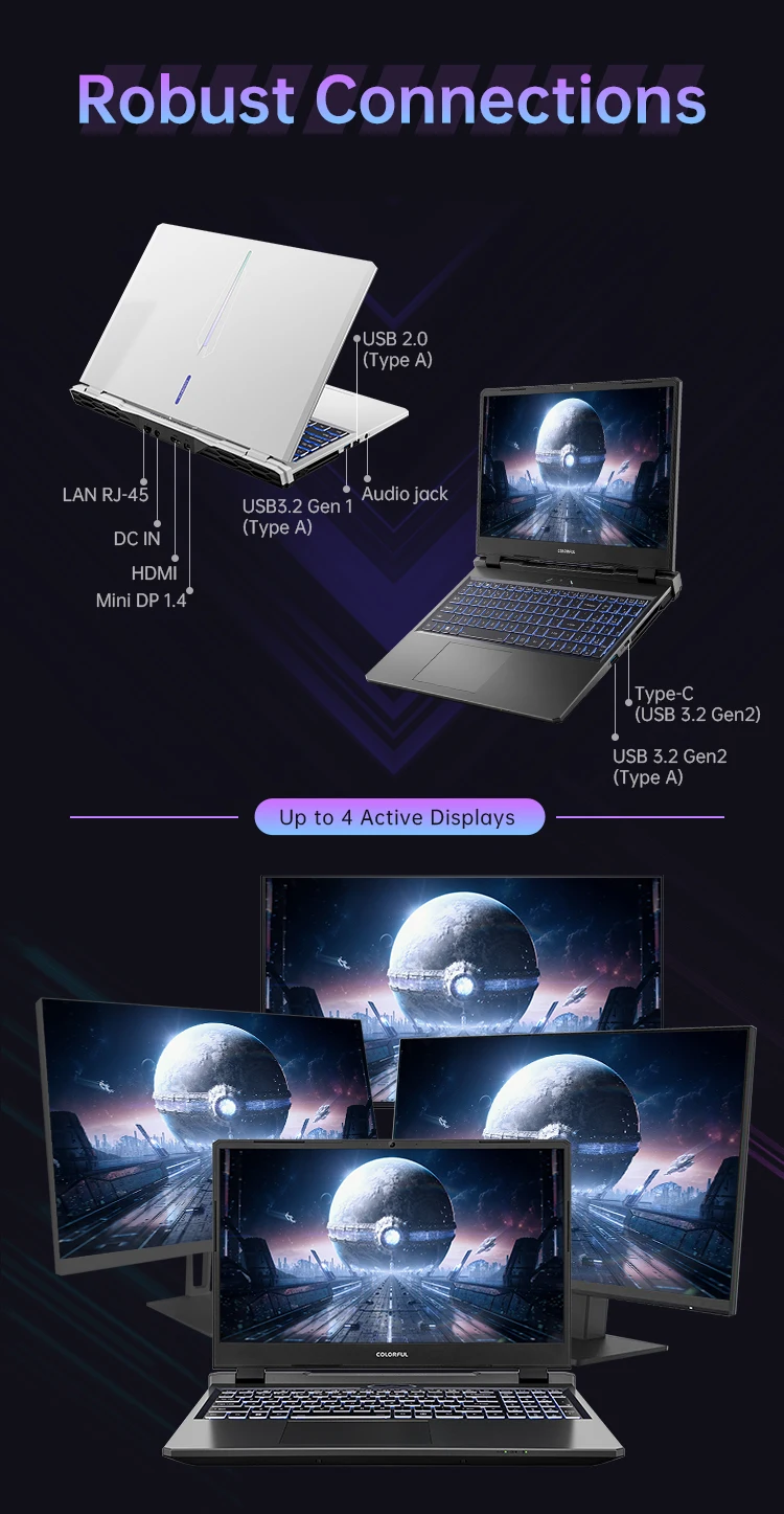 I/O Port = 1x USB3.2 Gen 1; 1x USB3.2 Gen 2; 1x USB2.0; 1x USB 3.2 Gen 2 Type-C; 1x HDMI output port (with HDCP) 2.1; 1x Ethernet (RJ-45); 1x Mini Display port 1.4; 1x 2-in-1 Audio Jack (Headphone/Microphone); 1x DC-in jack for AC adapter