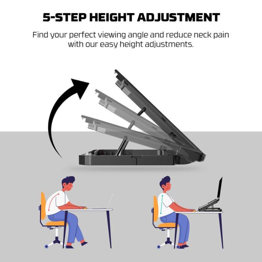 Notebook Cooler NC14 hadir dengan 5 tingkat ketinggian yang bisa disesuaikan, memberi sudut pandang paling nyaman dan bantu kurangi risiko nyeri leher kaibat posisi laptop yang kurang ideal.