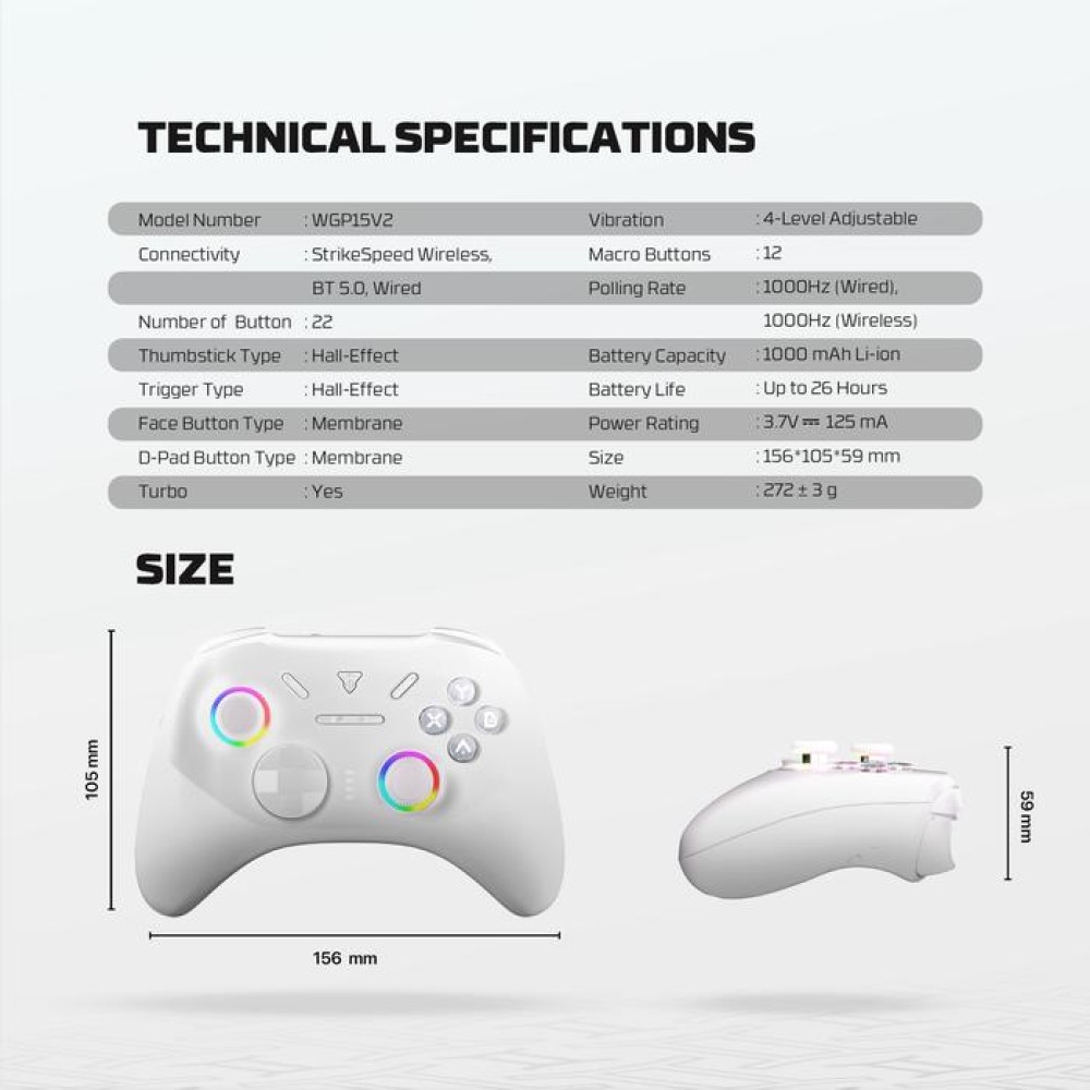 EOS Pro WGP15 menyediakan tiga mode konektivitas yaitu mode wireless menggunakan BT 5.0, wireless StrikeSpeed, dan mode wired menggunakan kabel USB Type-C. Nikmati kebebasan bermain game tanpa terganggu oleh lilitan kabel ataupun gerakan yang delay.