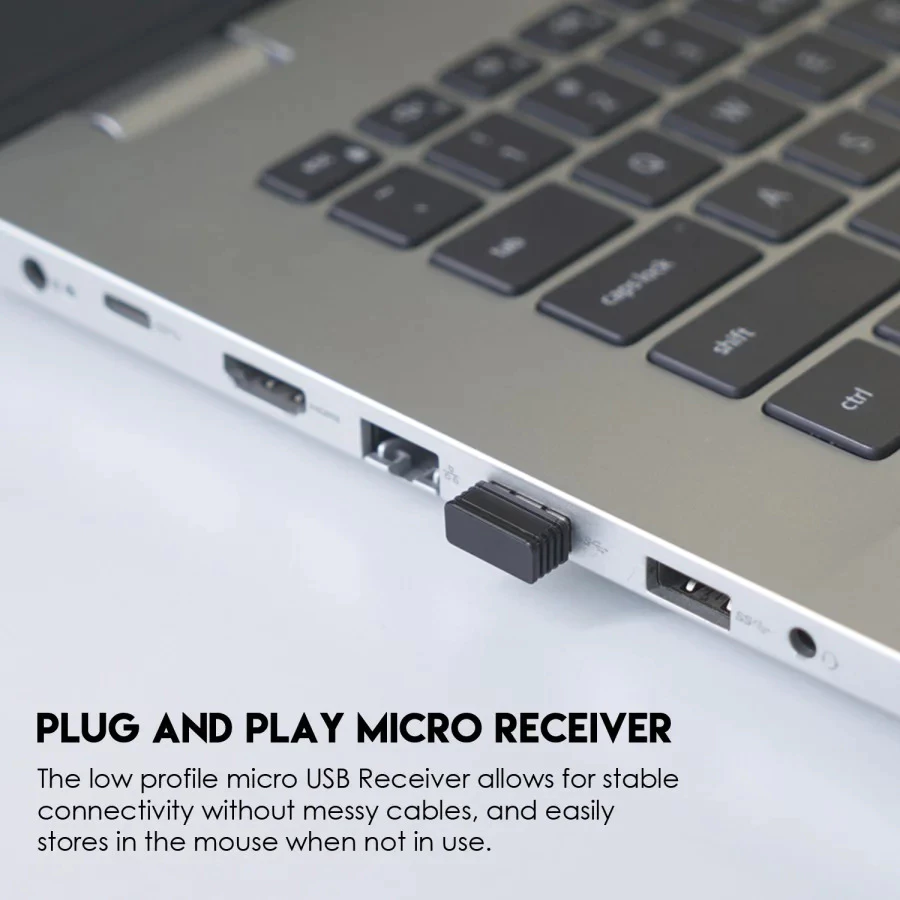 Memiliki micro USB Receiver minimalis yang mampu memberikan konektivitas stabil. Dengan begitu kamu juga tidak perlu lagi berurusan dengan kabel-kabel yang berantakan. Tidak perlu khawatir kehilangan USB Receiver karena bisa disimpan dengan mudah dalam mouse ketika tidak digunakan.