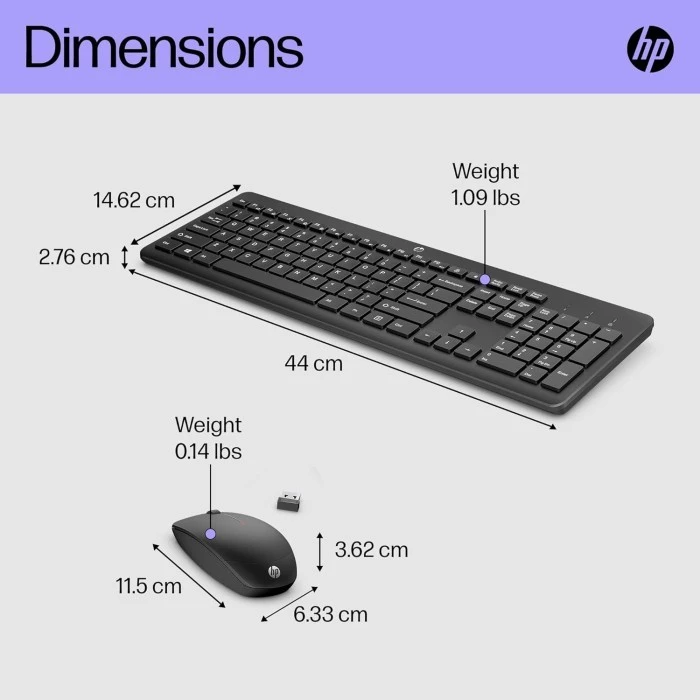 Dimensions (W X D X H) : 17.23 x 5.76 x 1.09 in (keyboard); 2.49 x 4.53 x 1.43 in (mouse)