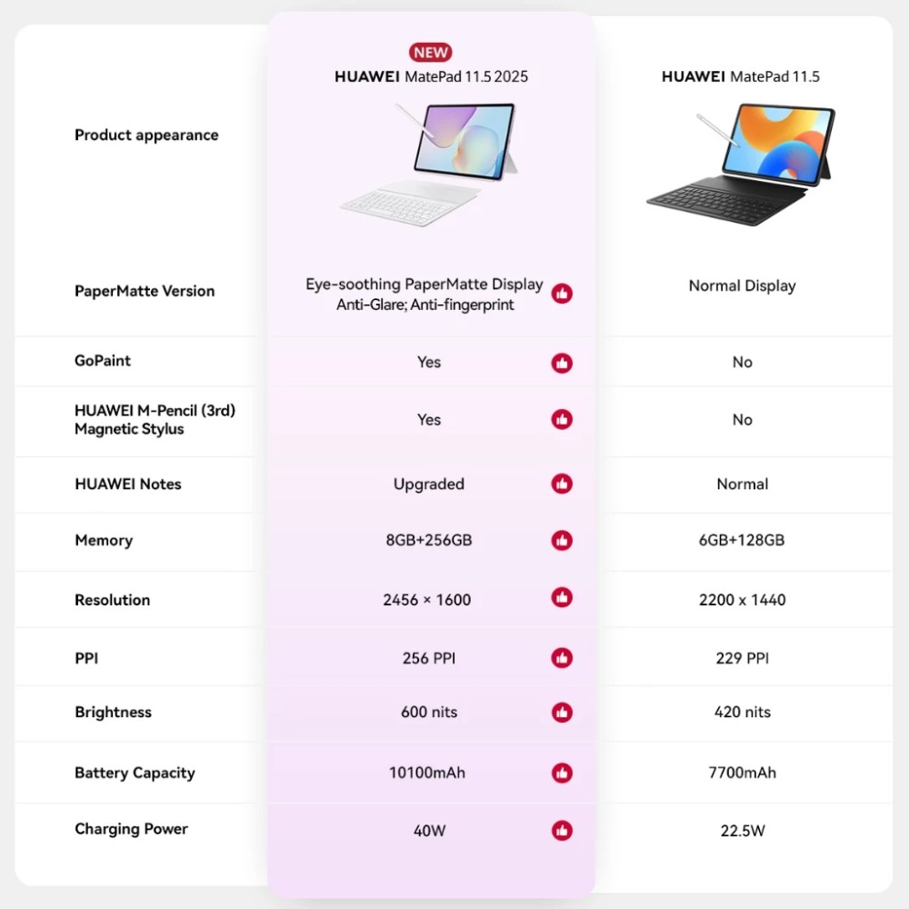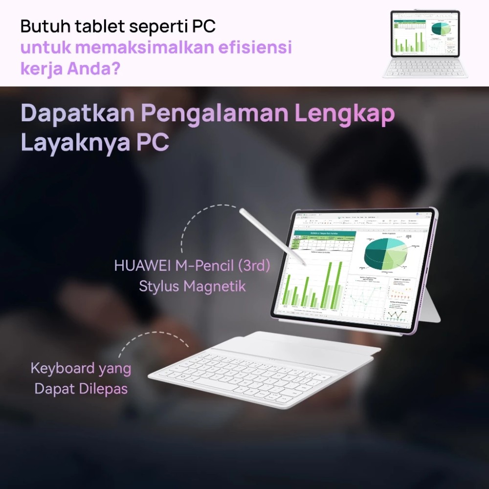 Tablet ini tampil ramping dengan desain unibody logam yang kuat, mudah dibawa, dan ditenagai baterai besar yang mampu memutar video hingga 14 jam. Mendukung HUAWEI M-Pencil generasi ke-3, MatePad 11.5 ideal untuk mencatat, menggambar, hingga bekerja kreatif melalui GoPaint dan fitur produktivitas seperti AI Handwriting Enhance serta Smart Keyboard yang dapat dilepas.