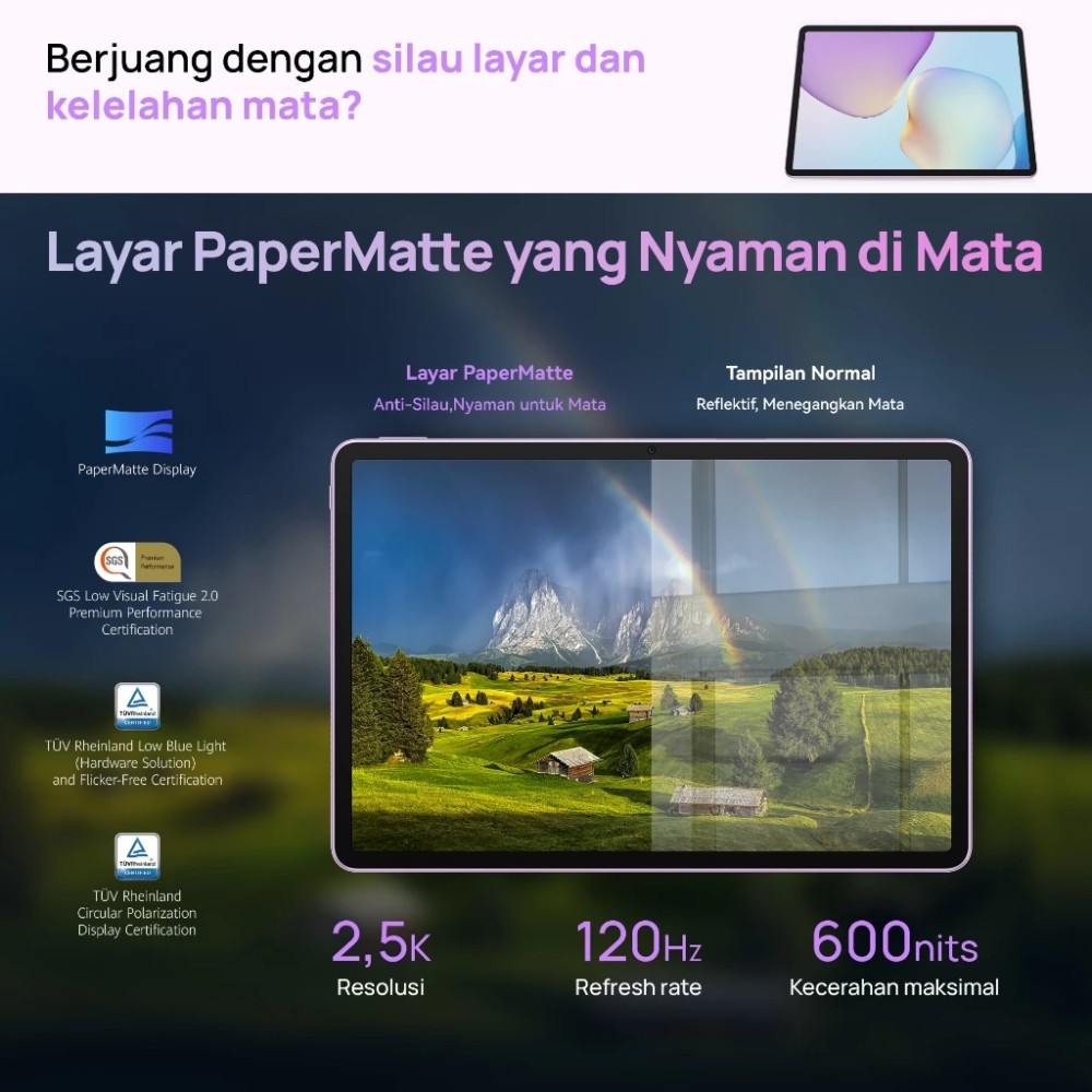 HUAWEI MatePad 11.5 menghadirkan pengalaman visual luar biasa melalui layar 11.5 inci HUAWEI FullView beresolusi 2.5K dan refresh rate 120 Hz. Teknologi anti-glare dan anti-refleksi memastikan visibilitas optimal di berbagai kondisi cahaya, sementara fitur kenyamanan mata tingkat perangkat keras membuat tampilan terasa alami dan nyaman sepanjang hari.