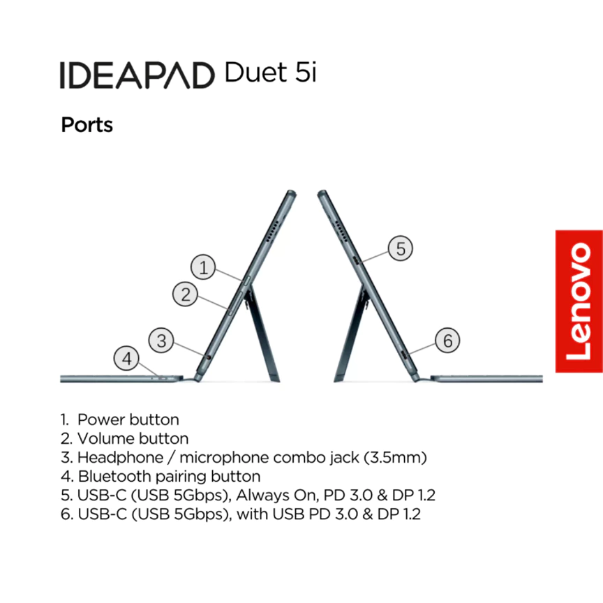 Ports : 1x USB-C® (USB 5Gbps / USB 3.2 Gen 1), with USB PD 3.0 and DisplayPort™ 1.2; 1x USB-C® (USB 5Gbps / USB 3.2 Gen 1), with USB PD 3.0 and DisplayPort™ 1.2, Always On; 1x Headphone / microphone combo jack (3.5mm); 1x Pogo pin connector (5-point)