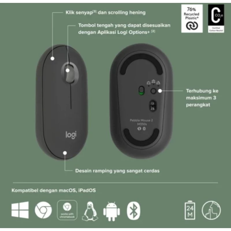 Kami tidak hanya berhenti pada desain yang unik, kami juga memastikan bahwa produk kami dibuat secara bertanggung jawab. Pebble Mouse 2 hadir dalam berbagai warna yang dibuat dengan lebih dari 50% plastik daur ulang Kandungan plastik1 Pebble Mouse 2 M350s: minimum 58% plastik daur ulang, tidak termasuk plastik dalam Printed Wiring Assembly (PWA) dan kemasan. sehingga Anda dapat memilih warna yang sesuai dengan suasana hati Anda.