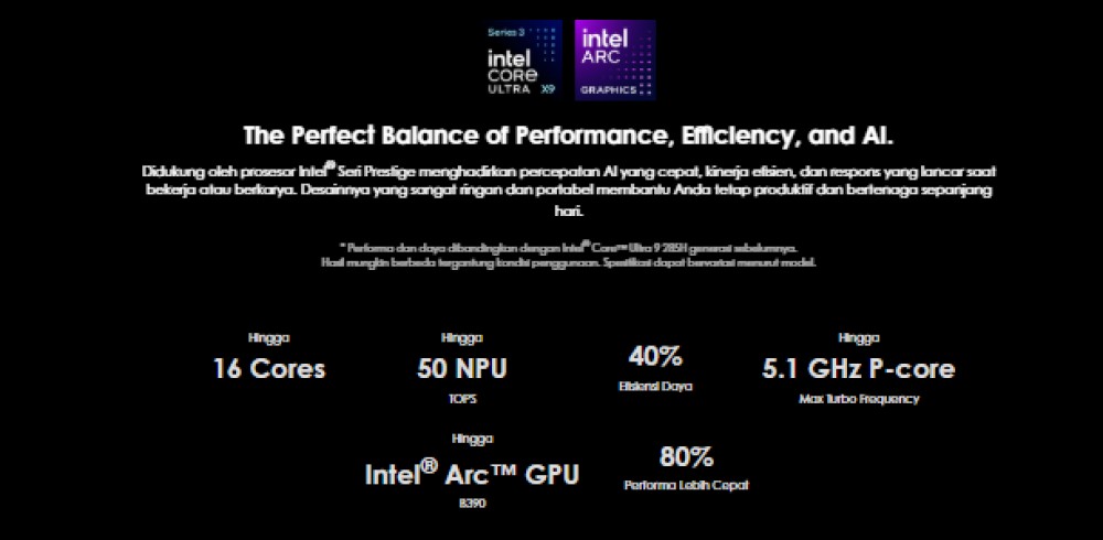 Processor : Intel Core Ultra 9 processor 386H with up to 50 NPU TOPS 16 cores (4 P-cores + 8 E-cores + 4 Low Power E-cores), 16 threads, 18MB Intel Smart Cache, Max Turbo Frequency 4.9 GHz