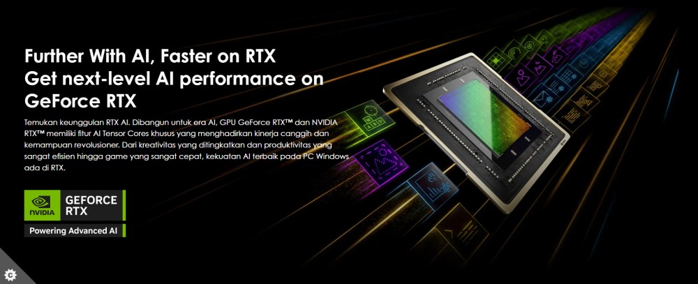 Temukan keunggulan RTX AI. Dibangun untuk era AI, GPU GeForce RTX™ dan NVIDIA RTX™ memiliki fitur AI Tensor Cores khusus yang menghadirkan kinerja canggih dan kemampuan revolusioner. Dari kreativitas yang ditingkatkan dan produktivitas yang sangat efisien hingga game yang sangat cepat, kekuatan AI terbaik pada PC Windows ada di RTX.
