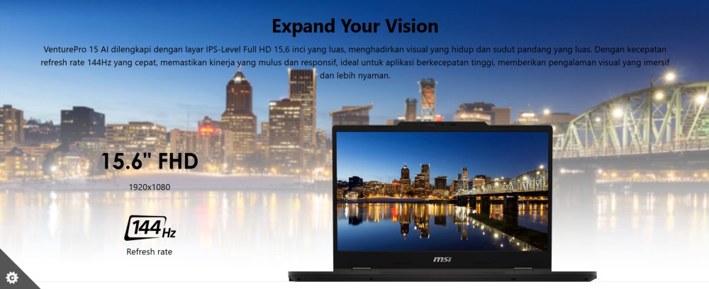 VenturePro 15 AI dilengkapi dengan layar IPS-Level Full HD 15,6 inci yang luas, menghadirkan visual yang hidup dan sudut pandang yang luas. Dengan kecepatan refresh rate 144Hz yang cepat, memastikan kinerja yang mulus dan responsif, ideal untuk aplikasi berkecepatan tinggi, memberikan pengalaman visual yang imersif dan lebih nyaman.