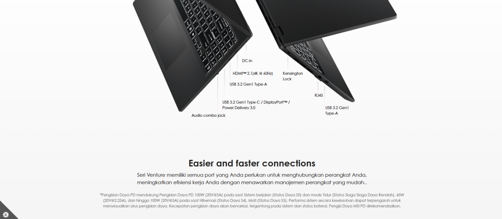 *Pengisian Daya PD mendukung Pengisian Daya PD 100W (20V@5A) pada saat Sistem berjalan (Status Daya S0) dan mode Tidur (Status Siaga Siaga Daya Rendah), 45W (20V@2.25A), dan hingga 100W (20V@5A) pada saat Hibernasi (Status Daya S4), Mati (Status Daya S5). Performa sistem secara keseluruhan dapat terpengaruh untuk menyesuaikan arus pengisian daya. Kecepatan pengisian daya akan bervariasi, tergantung pada sistem dan status baterai. Pengisi Daya MSI PD direkomendasikan.