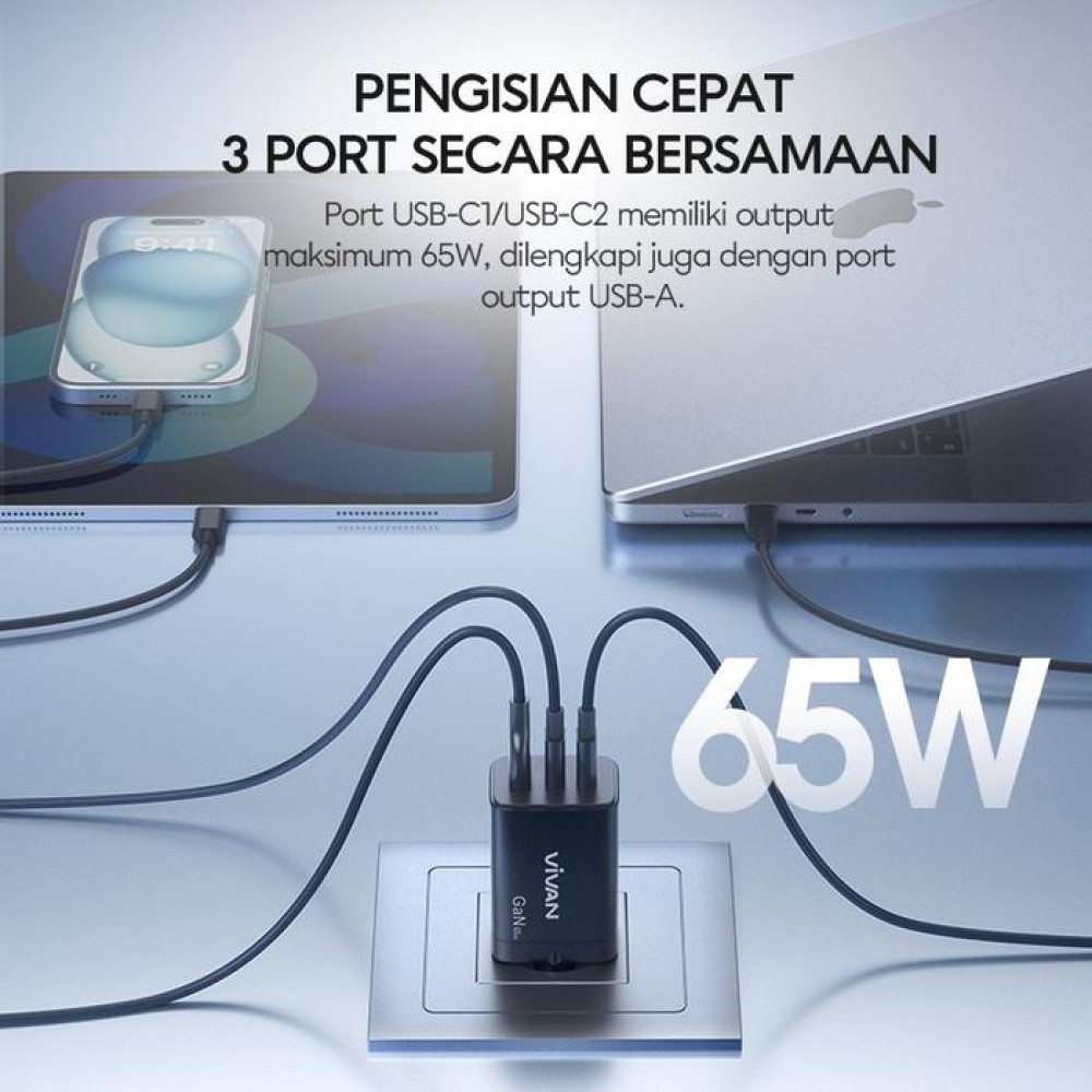2. Dengan bekal 3 Output ( 1 USB-A dan 2 USB-C) charger ini dapat digunakan untuk mengisi 3 perangkat secara bersamaan.