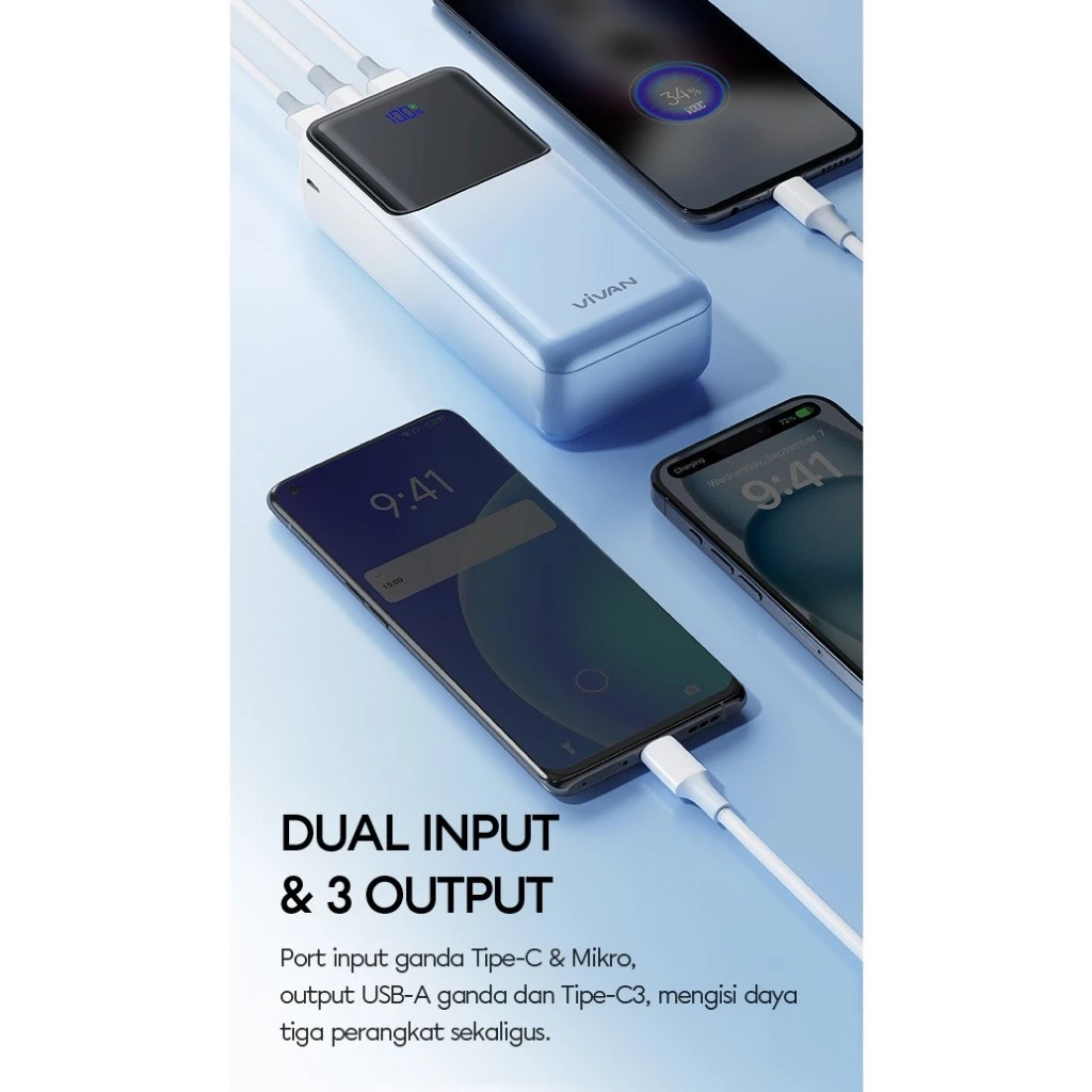 5. Dual port input (Micro USB & Type-C) dan 3 Output (Dual port Output USB-A & 1 Type-C). Dapat digunakan untuk mengisi daya 3 perangkat secara bersamaan.