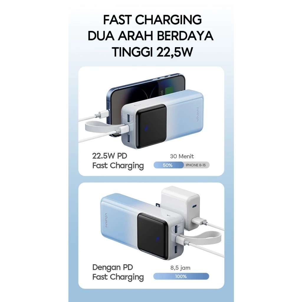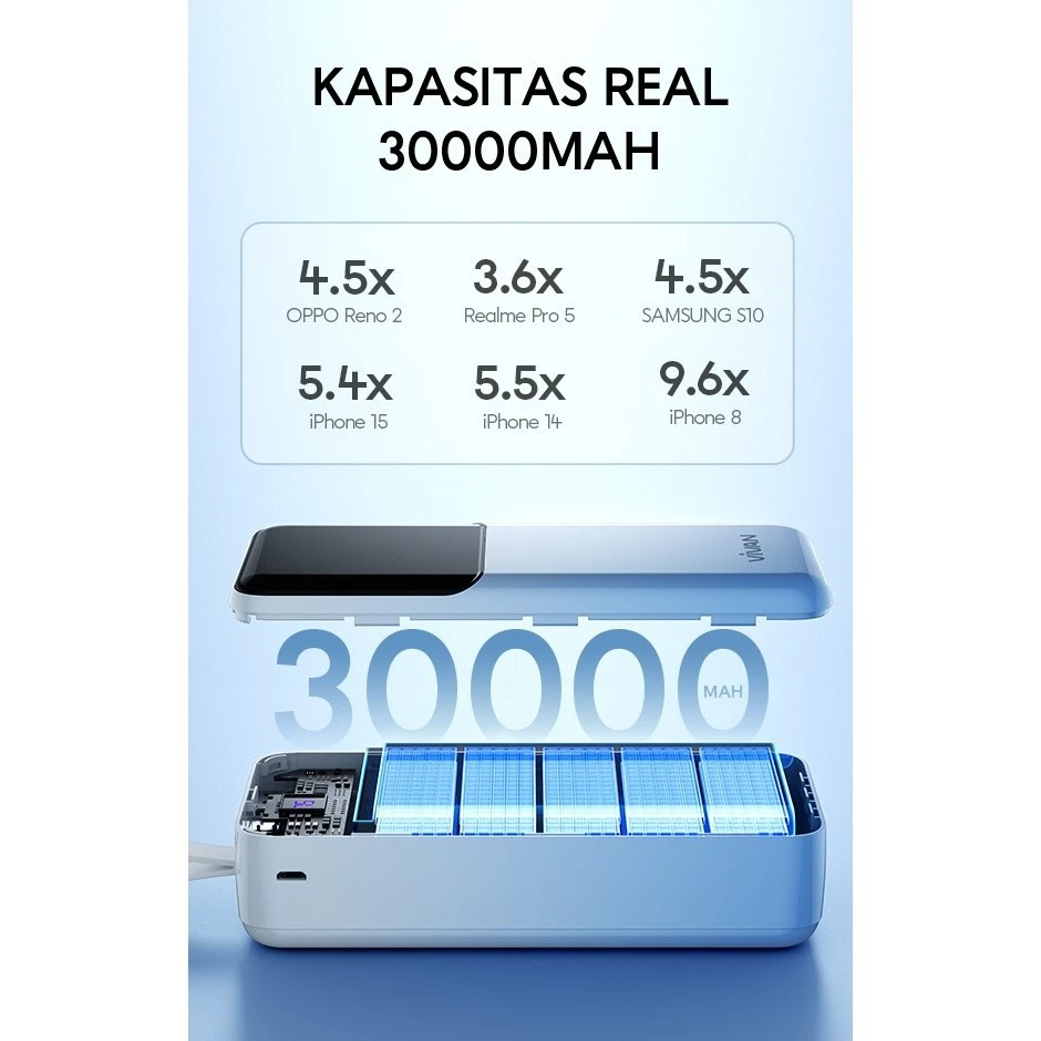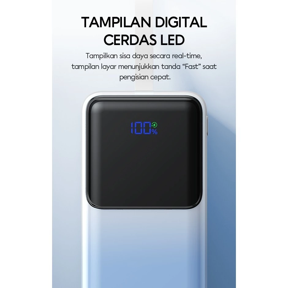 8. Hadir eksklusif dengan Large Screen LED Battery Display dan keterangan notifikasi "FAST" ketika powerbank terhubung untuk pengisian daya cepat atau Quick Charging