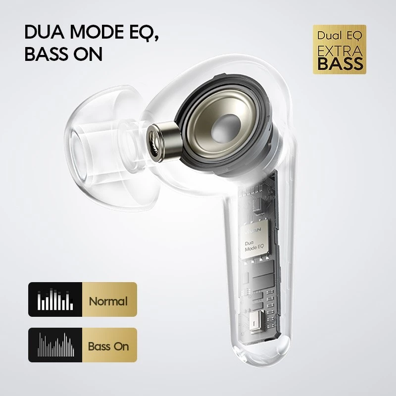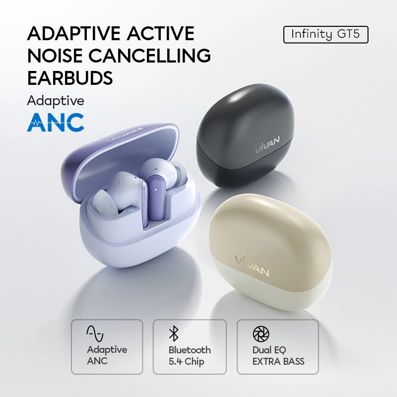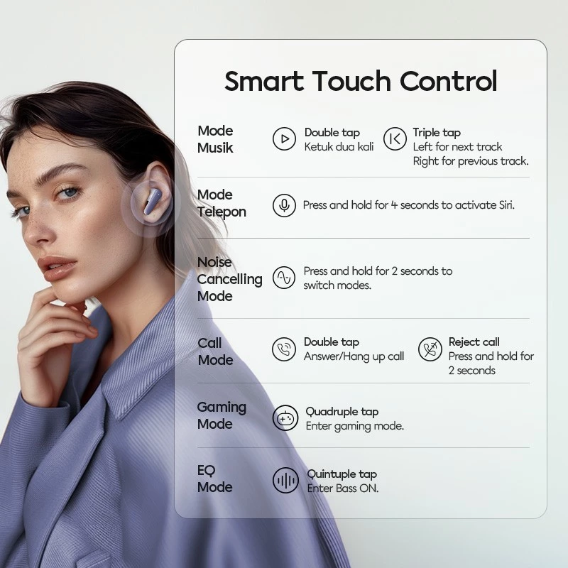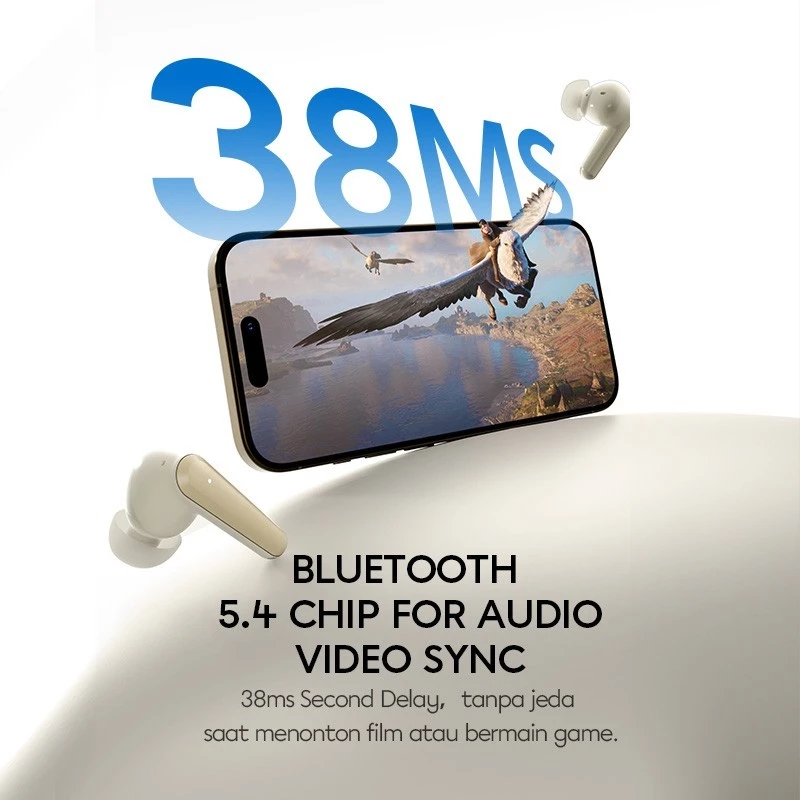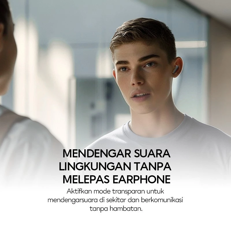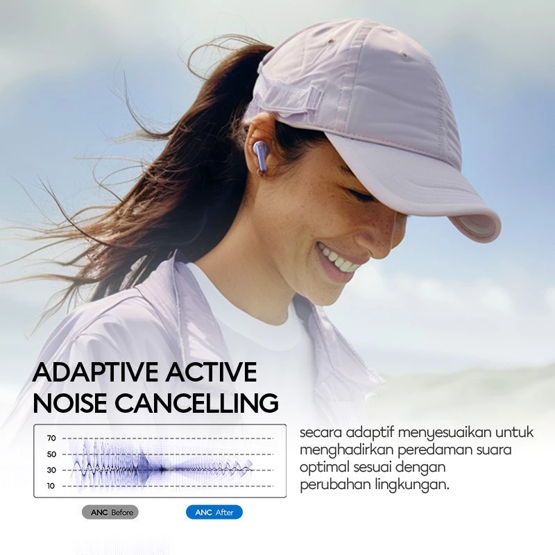 Suara jernih dengan efek bass maksimal. Dilengkapi fitur Adaptive ANC untuk meredam kebisingan, saat melakukan panggilan Telepon di keramaian.