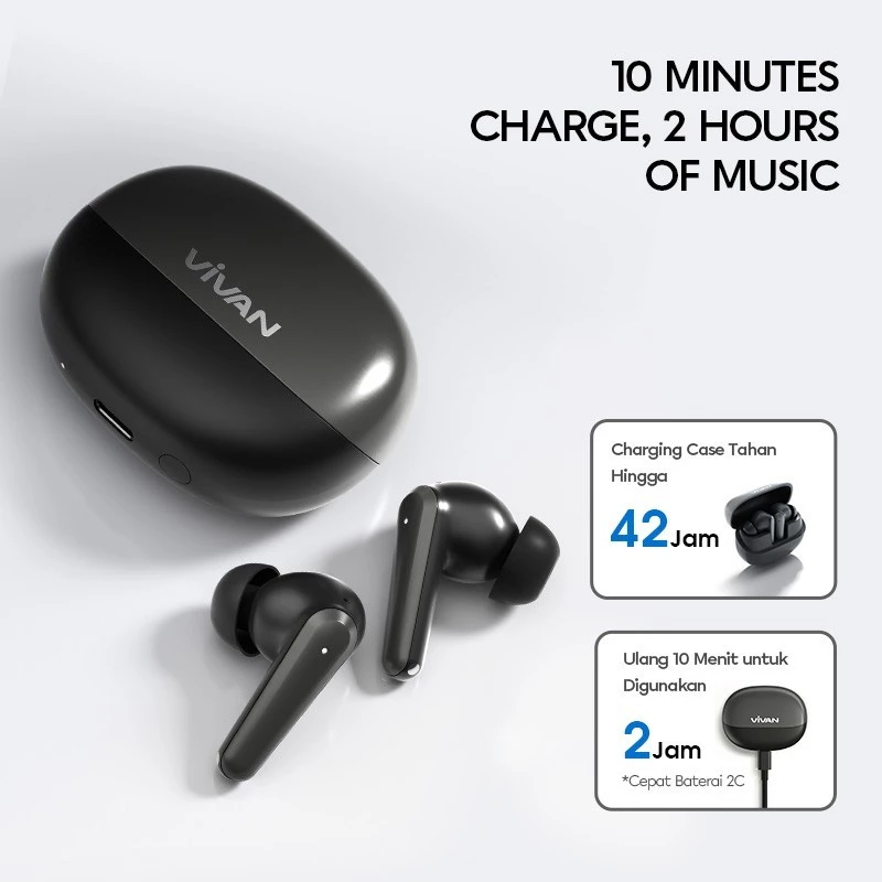 Playtime hingga 42 Jam (10 Jam daya tahan baterai earbud + 32 Jam daya charging case) untuk nikmati musik dan konten digital lain dalam durasi yang lebih lama.